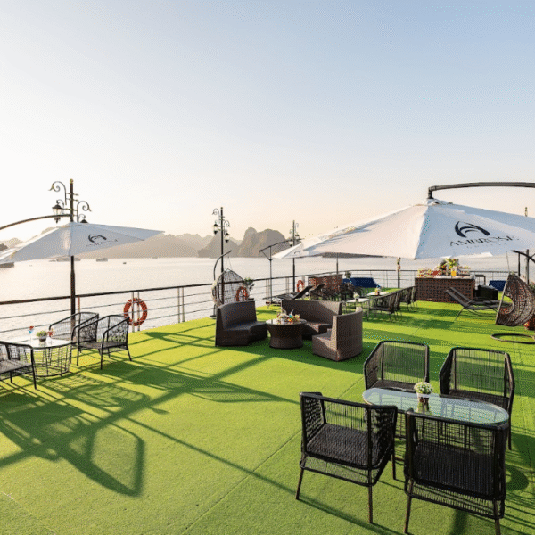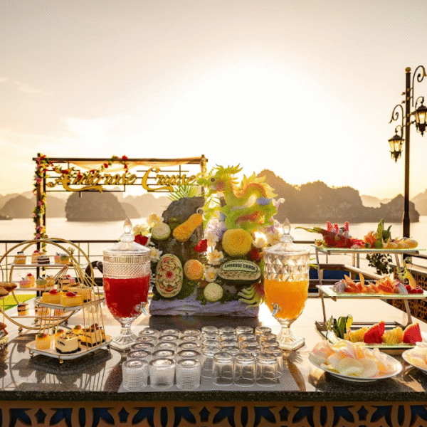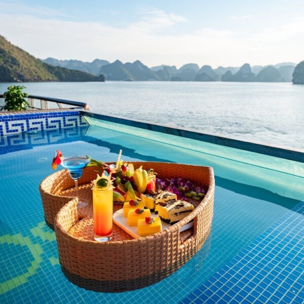 15:30 | Return to the ship for the Sunset Party, relax in the mini pool on the sundeck, enjoy snacks and sip a drink to watch the beautiful sunset tenderly, poetically to peace over Halong Bay.